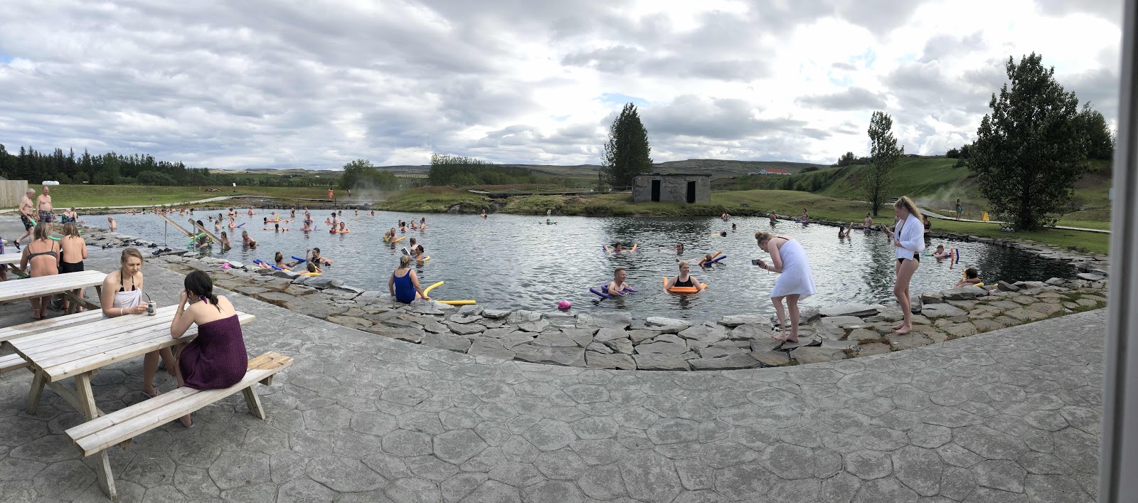 Danach total müde und satt ging es nur 1,8 km weiter in die „Secret Lagoon“ auf ein Bad in der Wärme. Hier wird sehr auf Hygiene geachtet und man muss sich vorher gut und mit Seife duschen bevor man ins Wasser geht. Draußen recht frisch aber drinnen war es mega warm. Je näher man an den Wassereinlass von der 100 Grad heißen Quelle kam desto unerträglich wärmer würde es im erlaubten Schwimmbecken, das ca. 1,2m tief war. Der Himmel hatte sich inzwischen zugezogen und es kamen ein paar Tropfen von oben. Aber zum Glück nur ein paar, sodass die Haare trocken blieben. Doch zu lange haben wir es mit den Schwimmnudeln nicht ausgehalten und sind wieder raus, duschen und ab ins Auto ausdampfen und trinken.