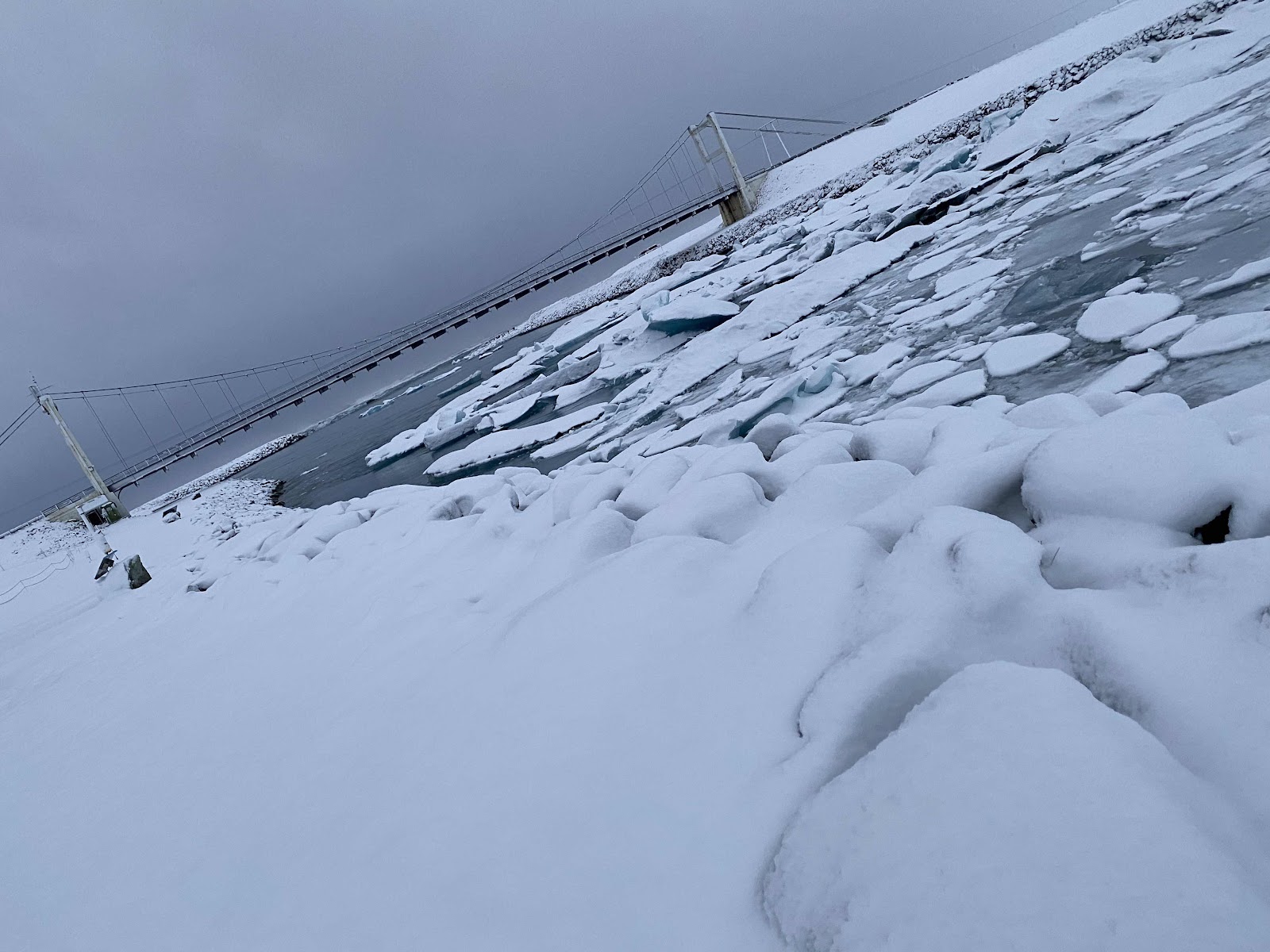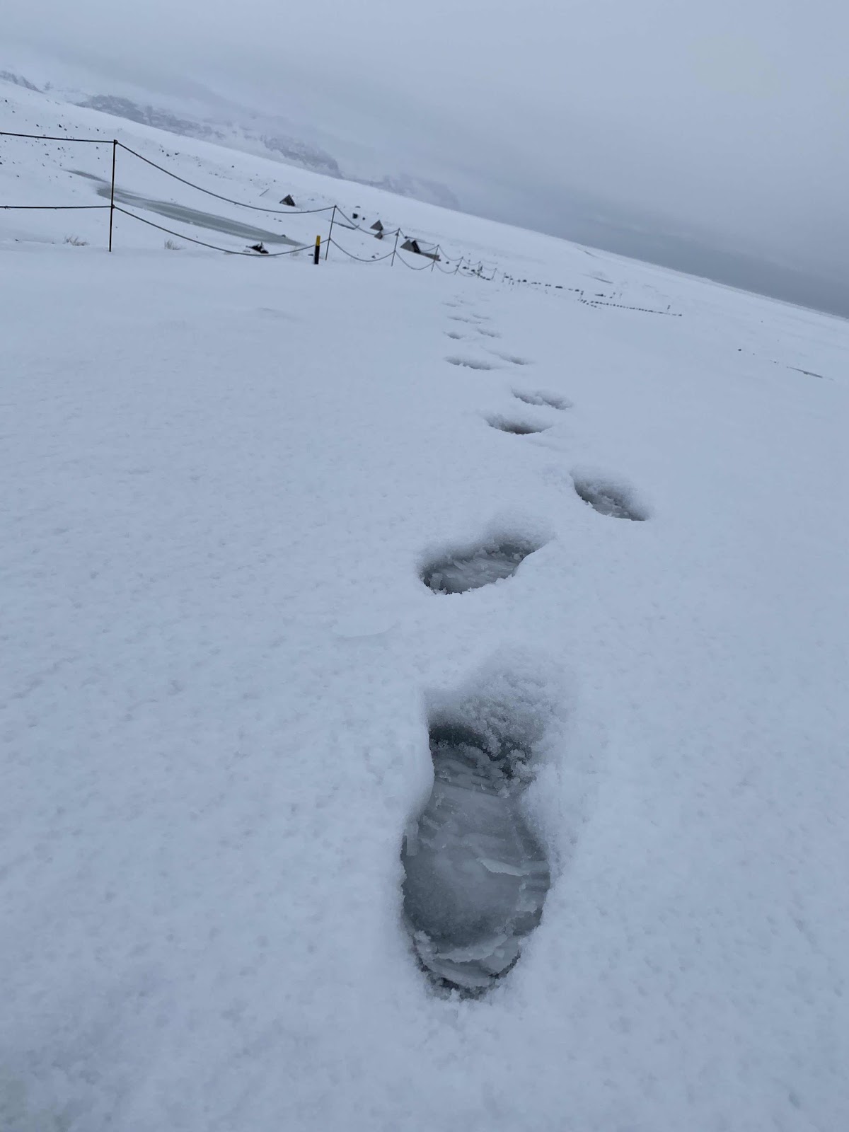 Ein wenig entfernt war eine weitere Gletscherzunge - Fjallsarlon. Die Zufahrt war nicht geräumt und außerdem stand ein SUV mitten auf der Zufahrt und obwohl jemand drin saß, machte er keine Anstalten den Weg frei zu machen. Da haben wir uns etwas hinter der Einfahrt an die Seite gestellt und sind los gelaufen. Der Regen war nicht mehr so stark und wir konnten gemütlich durch den Schnee stapfen. Der Rundweg war zwar gekennzeichnet, aber als wir auf dem Hügel waren, war klar mit Rundweg ist nix heute. Zumindest konnten wir ein paar Bilder machen und sind danach wieder zum Auto zurück.