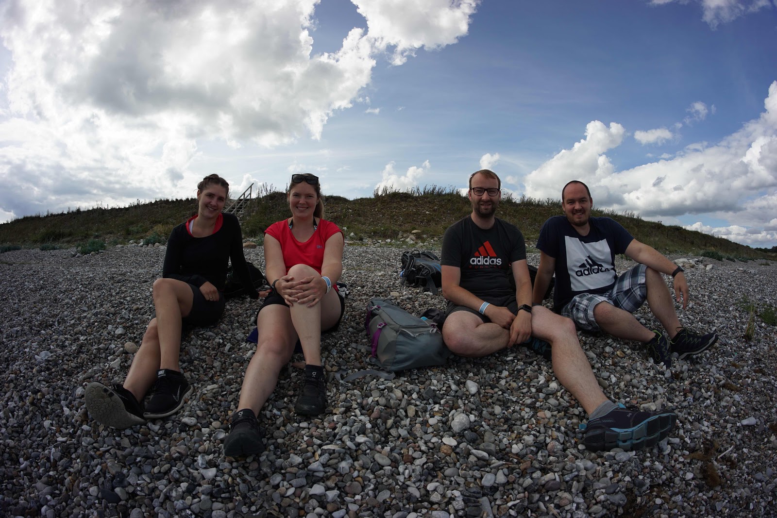 Dann ging es aber los. Bis zum Ziel sollten es 8 km sein. Erstmal durch die Stadt Ebeltoft und dann entlang der Straße. Es gab irgendwie keine Option durch den Wald, der uns auch zum Ziel gebracht hätte. Also liefen wir entlang der Straße(n) vorbei an schönen Getreidefeldern mit Mohn- und Kornblumen und Bäumen. Viel mehr Spannendes war leider nicht dabei unterwegs. Als wir am Ziel der Navigation angekommen waren, mussten wir feststellen, dass es dort keinen Weg zu Strand gab. Also musste der Navigator der Gruppe übernehmen und nach kurzer routinierter Recherche waren wir auf dem direkten Weg zum Strand. Allerdings nicht nach 8, sondern nach 9,6 km. (Sicht der Männer) Aus Frauensicht haben wir erkannt, dass es am Zielpunkt der Route nicht zum Meer hinab ging, kurz wurde auf Maps nachgesehen und ein neuer Weg zum Strand gefunden.