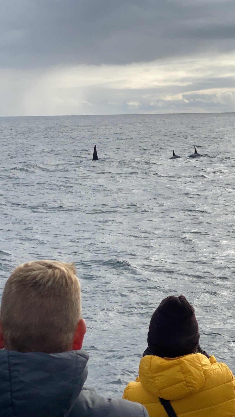 Dann erneut Panik auf dem Schiff und Motor aus. Eine Orca Gruppe! Und kurz vorher hatte sich Moni noch Orcas gewünscht für heute. Denen sind wir gemütlich etwas gefolgt. Da war vom großen bis zum baby Orca alles dabei. Nicht schlecht für eine Tour: Zwergwale, Pottwale, Finnwale und Orcas. Da hat sich der Zufall, über den wir die Tour gefunden haben, mal so richtig ausgezahlt.