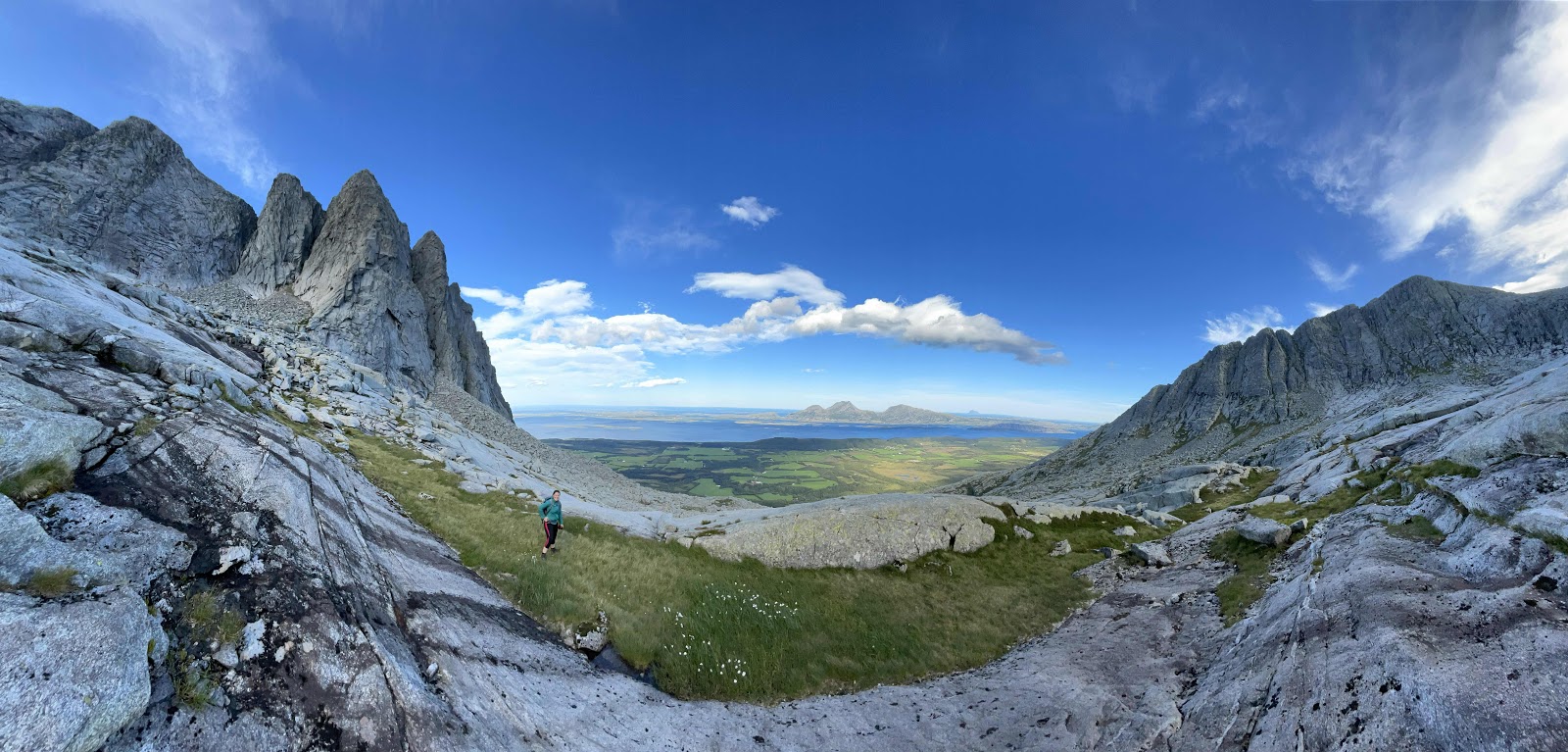 Allerdings wollten wir noch auf das Plateau hoch, von dem aus man auf den Gipfel Skjæringen oder Tvillinge gehen konnte. Doch leider, bei ca. 600 Höhenmetern angekommen, war der Wind so stark, dass wir uns entschieden es zu lassen. Wenn einen eine Windböe attackiert während man ohne viel Halt über einen Felsen kraxelt, dann wurde das schon heftig. Also, „know your Limits“. Nach einer Fotosession von der erreichten Höhe ging es wieder bergab. Kurz darauf trafen wir auf eine Familie, sie waren noch knapp über das Plateau (ca. 760 Höhenmeter), haben aber ebenfalls keinen Gipfel erklommen, da es auch ihnen zu windig wurde. Wenn es ums Wandern geht, sind die Norweger echt hart im nehmen und wetterfest. Auf dem Weg nach unten kamen und noch ein paar Wanderer und Wanderinnen mit Kind entgegen. Also wirklich ein „Familienweg“.