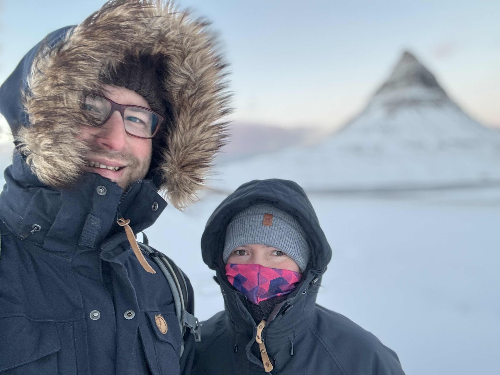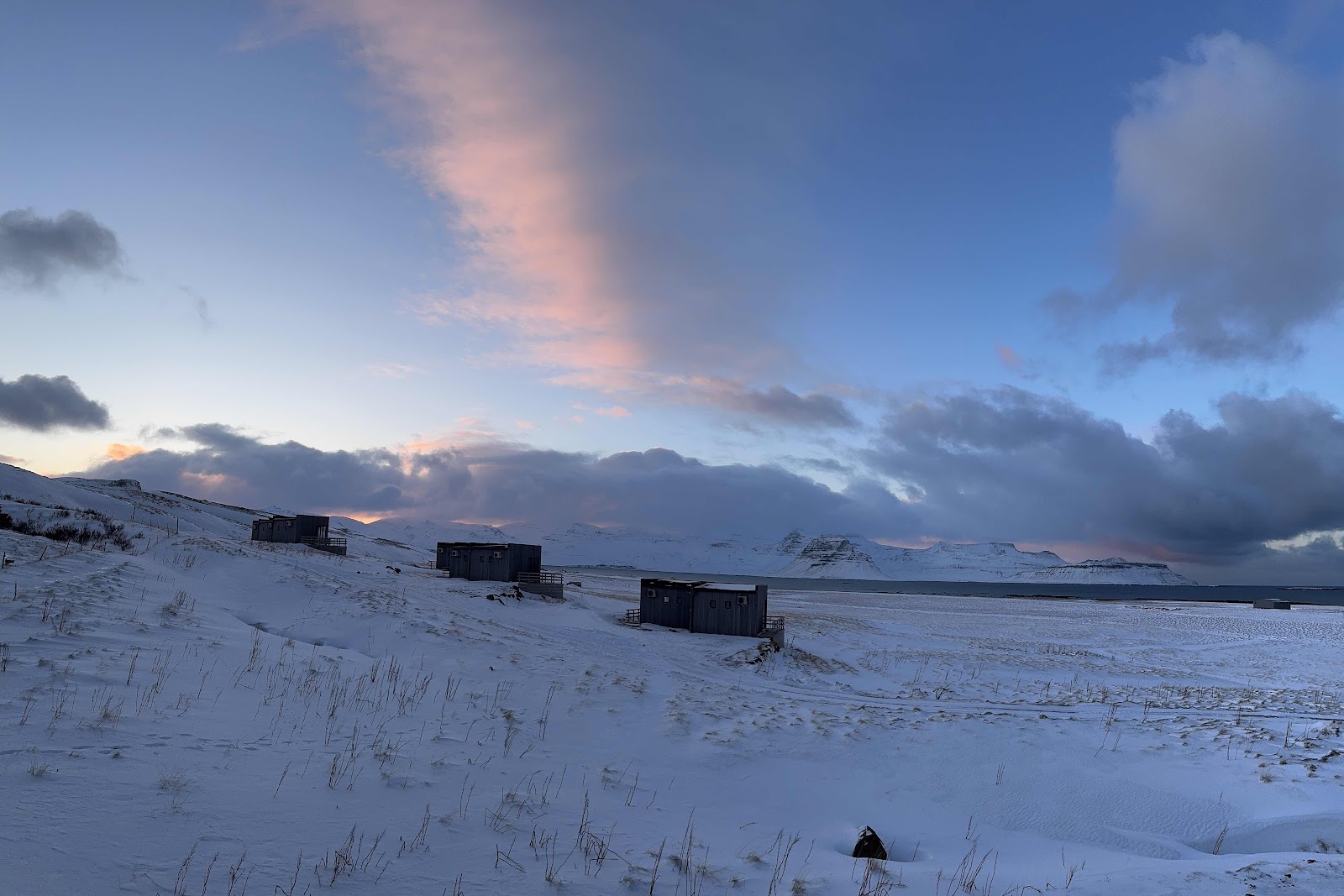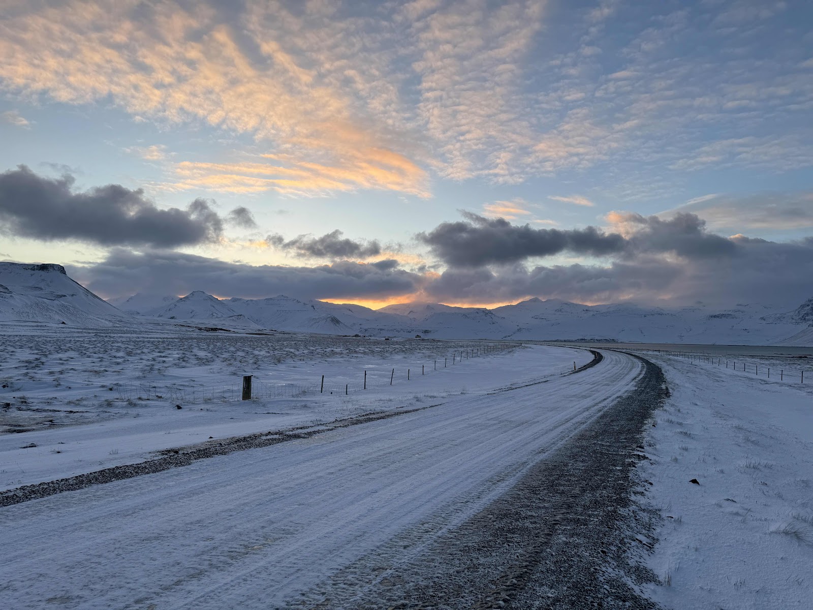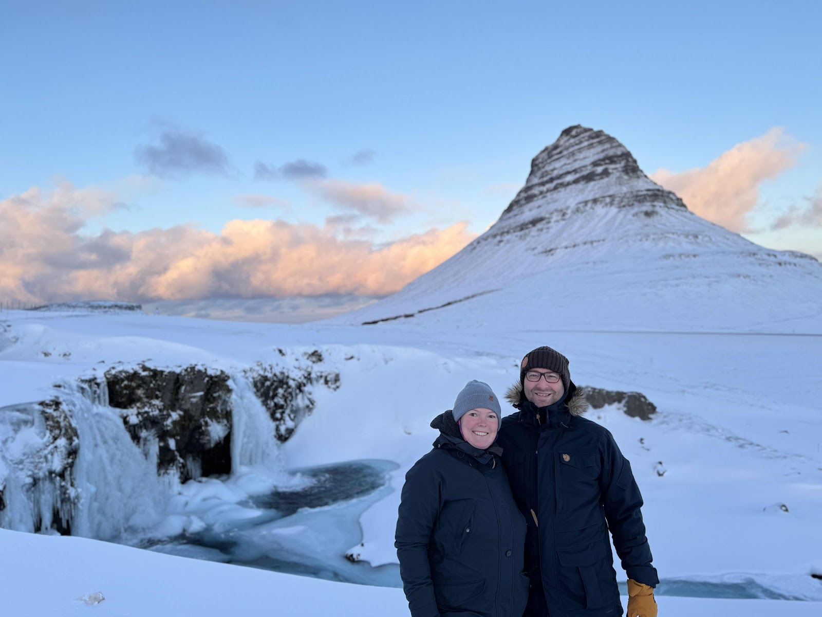 Gestärkt sind wir dann nochmal zum Kirkjufell gefahren. Wieder war der Parkplatz voll. Erst gab es ein paar Fotos - die Wolken hatten eine leicht rosa Färbung angenommen, aber wir wollten spazieren gehen. Allzuviel Bewegung gab es die letzten Tage nicht. Hinter den Wasserfällen führt ein Weg Richtung Grundarfjördur. Dem sind wir dann ein wenig gefolgt und durch den vereisten Schnee gestapft. Zu weit sind wir nicht gegangen, aber es war auch anstrengend, teilweise trug uns der vereiste Schnee, teilweise sind wir „eingebrochen“. Aber so haben wir den Kirkjufell noch in Ruhe von anderen Winkeln gesehen und waren etwas aus dem Touristen Trubel und den frierenden Asiaten. Ausgekühlt kamen wir zum Auto zurück und fuhren zur Unterkunft zurück.