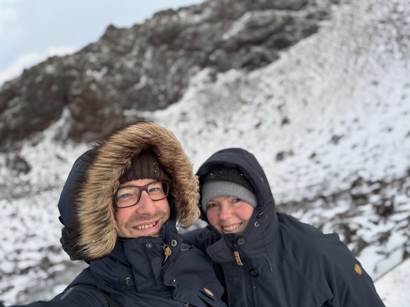 Los ging es Richtung Nationalpark wo wir im Besucherzentrum nach kleinen Wanderungen fragen wollten. Emphohlen wurde uns ein Alter Vulkankrater, der vor 3000-4000 Jahren ausgebrochen war. Hier führte ein Weg mit Treppen präpariert ein paar Meter hoch. Der Wind war richtig stark und der leichte Schnee, der fiel, war wie Hagel auf der Haut. Ein paar Fotos da oben, leider war die Sicht auf den Snæfells nichts so gut, da es auch recht bewölkt war.
