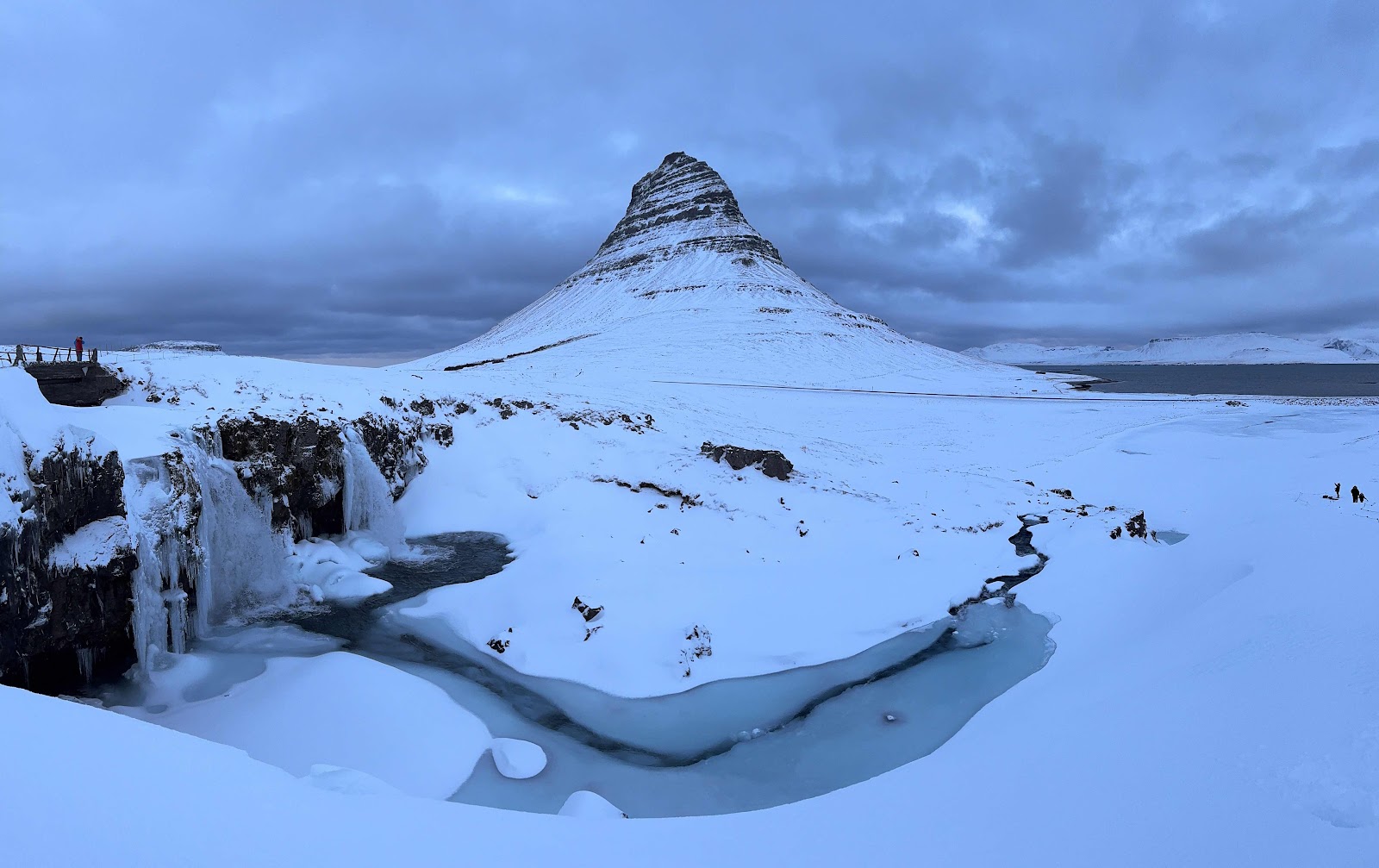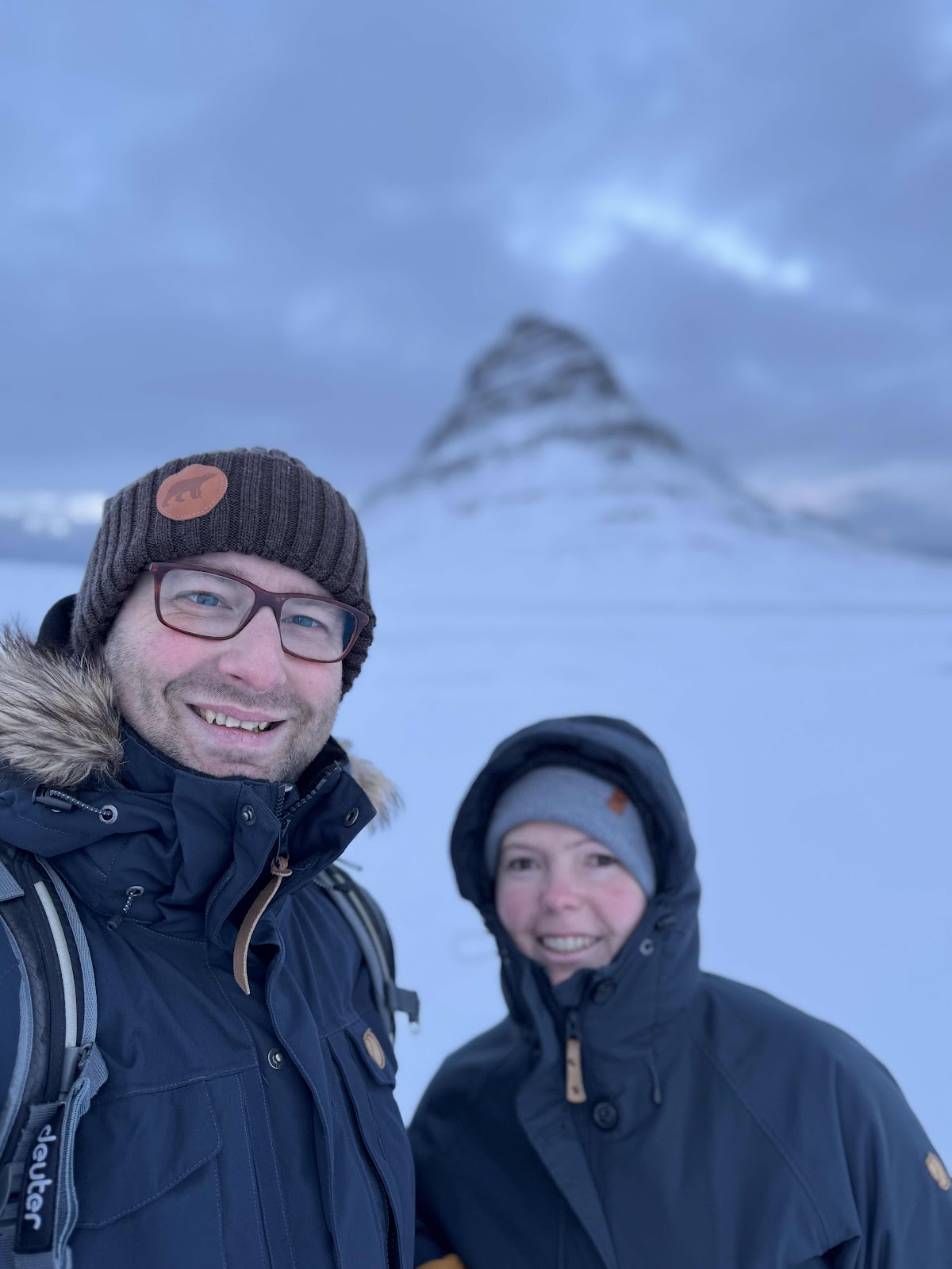 Danach ging es noch zum Svödufoss. Vom eisigen Parkplatz bis zum neu gebauten Aussichtspunkt kurz vor dem Wasserfall waren es knapp 700m. Erst einmal waren wir alleine und Christian konnte die Kamera aufbauen und fotografieren. Moni wurde es so langsam dann doch gut kalt. Nachdem 4 Andere auch den Wasserfall kürzer als wir besucht hatten, machten wir uns auf den Rückweg zum Auto. Da wir nicht zum Visitor Center zurück fahren wollten, hofften wir auf Essen in Grundafjordur. Doch da es schon kurz nach 14 Uhr war, hofften wir vergebens. Also ging es erst einmal zum Kirkjufell. Hier muss man nun fürs Parken zahlen. Wetter und Ausblick waren solala, aber Christian wollte dennoch die ersten Bilder machen. Nunja, am Notebook hat er dann abends gesehen: nicht gut - wir müssen morgen noch mal hin.