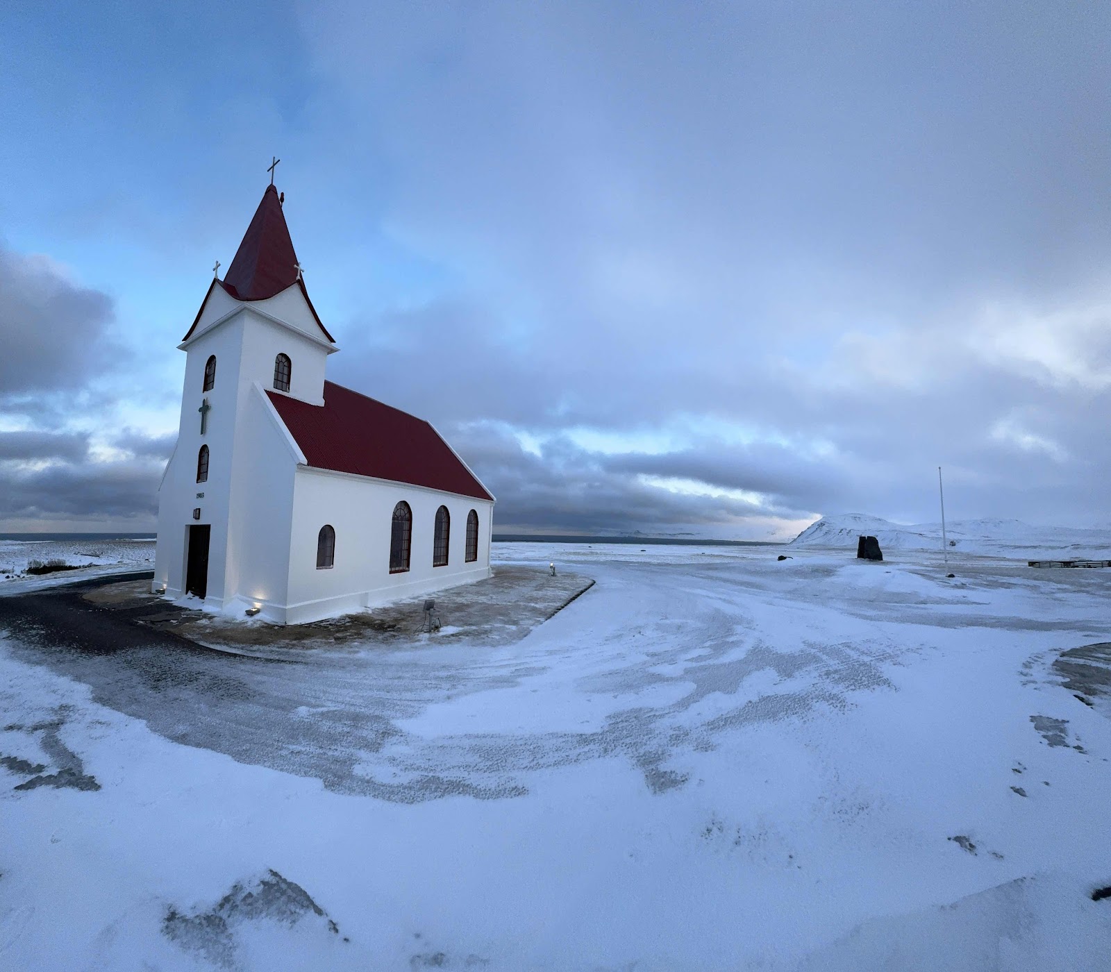 Im Besucherzentrum hatten sie uns auch gesagt, dass sie das einzig offene Restaurant und Café in der Gegend um Olafsvik waren. Aber bis auf einen Café für Christian haben wir nichts getrunken. Auf dem Rückweg Richtung Grundafjördur haben wir noch an einer Kirche halt gemacht, hier war der Kampf wieder mit dem Wind die Autotür festzuhalten, aber da der Untergrund eisig war, war die Frage wer stärker ist: Wind oder Schuhe auf dem Eis …