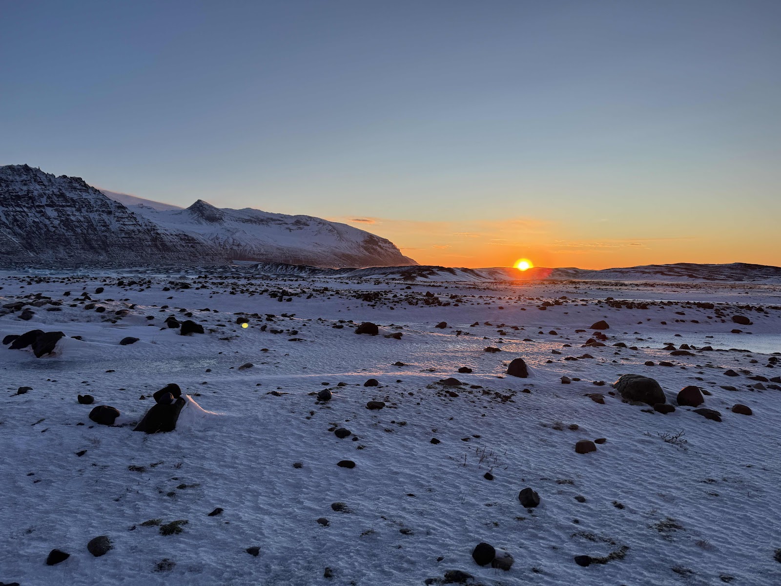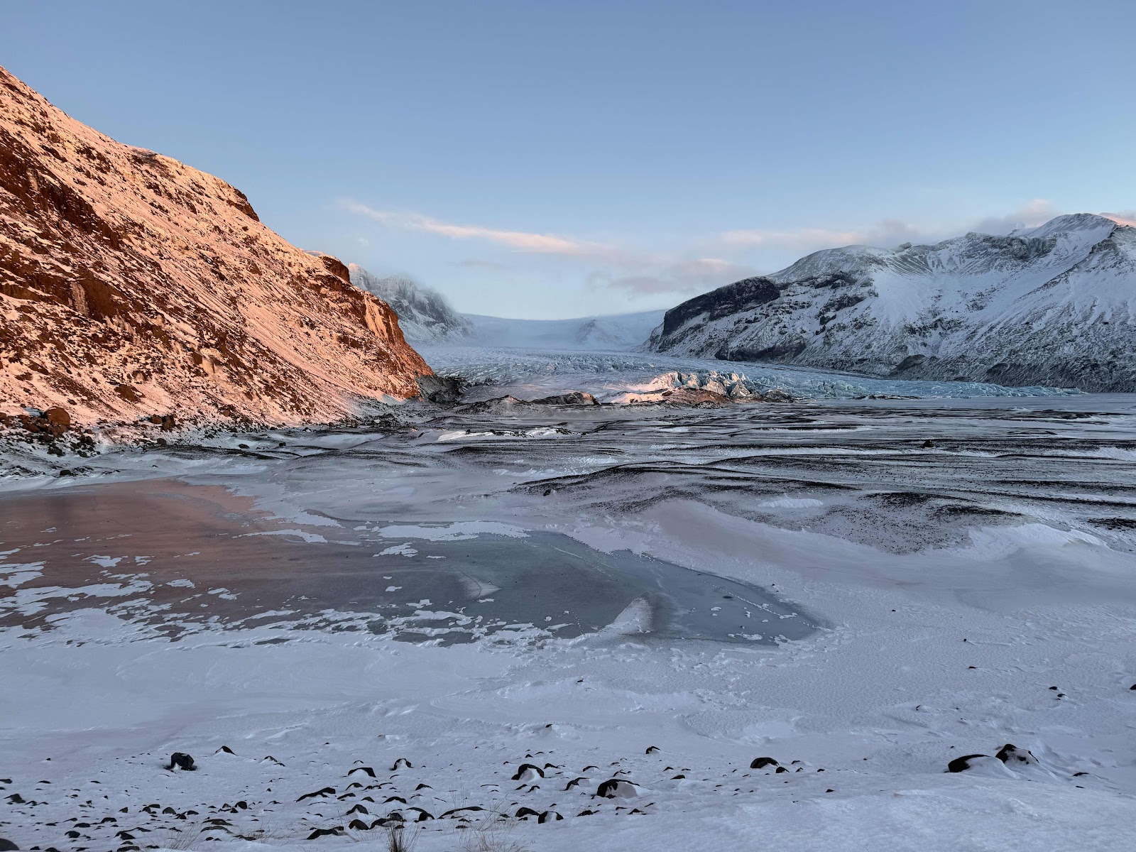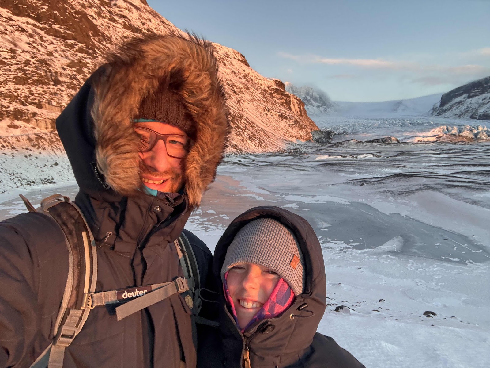 Nach knapp einer Stunde Fahrt waren wir am Parkplatz vom Skaftafell Visitor Center angekommen. Das war unser erstes Zwischenziel für eine kleine Wanderung Richtung Skaftafell Gletscher. Vom Parkplatz aus waren es knapp 2km zu laufen. Nicht sehr weit, aber bei -6 Grad und zusätzlich stürmischem Wind war es teilweise anstrengend zu anzulaufen. An den Infotafeln angekommen war gerade extremer Wind. Also wurden fix ein paar Bilder gemacht und dann auf den Rückweg. Dieses mal war der zwar eine Unterstützung bzw. der Wind drängte uns zu schnellen Schritten, allerdings bei dem Weg hat es das nicht immer einfach gemacht.