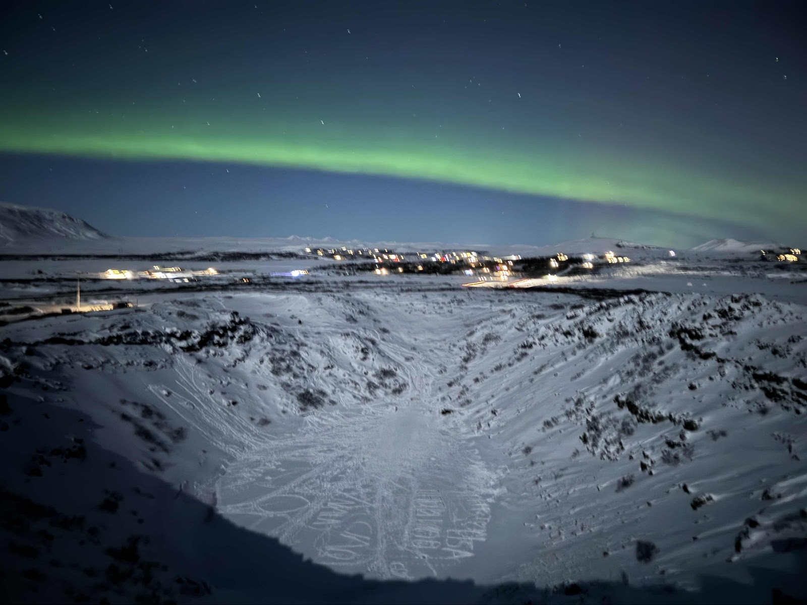 Vollgegessen sind wir anschließend kurz in Hotel und haben uns warm angezogen. Es ging noch zum Kerið - einem Vulkankrater. Auf dem Weg waren überall Lichter und so waren wir uns unsicher, ob Nordlichter zu sehen sind. Am Parkplatz angekommen, war dann aber ein Streifen am Himmel zu erkennen. Und ja, es war tatsächlich keine Wolke. Also Equipment geschnappt und los. Es waren nur wenig Meter und wir waren am Spot. Leider war der Mond schon wieder so stark und hat einen großen Schatten in den Krater geworfen. Naja, ein paar Bilder später haben wir wieder zusammengepackt.