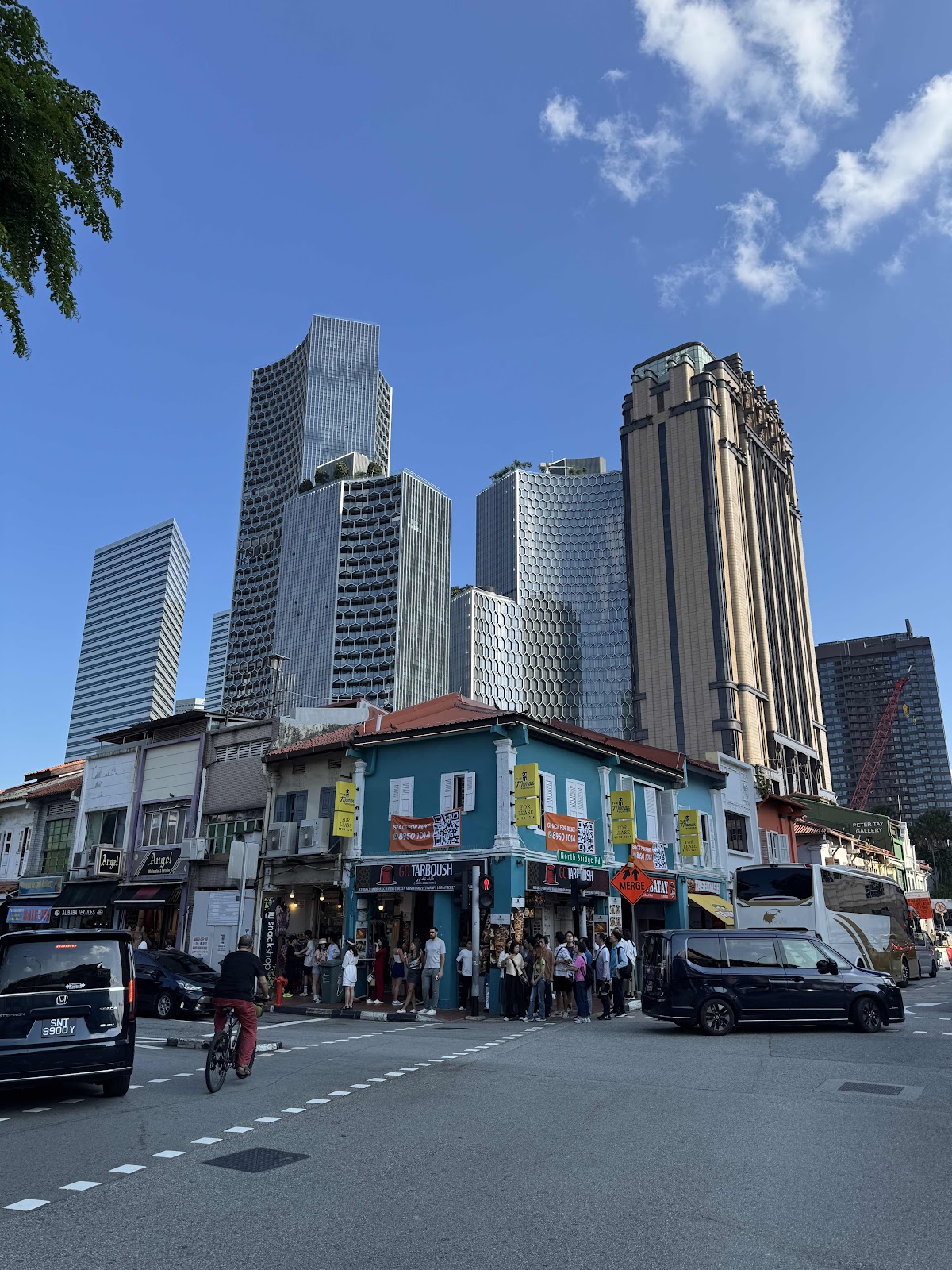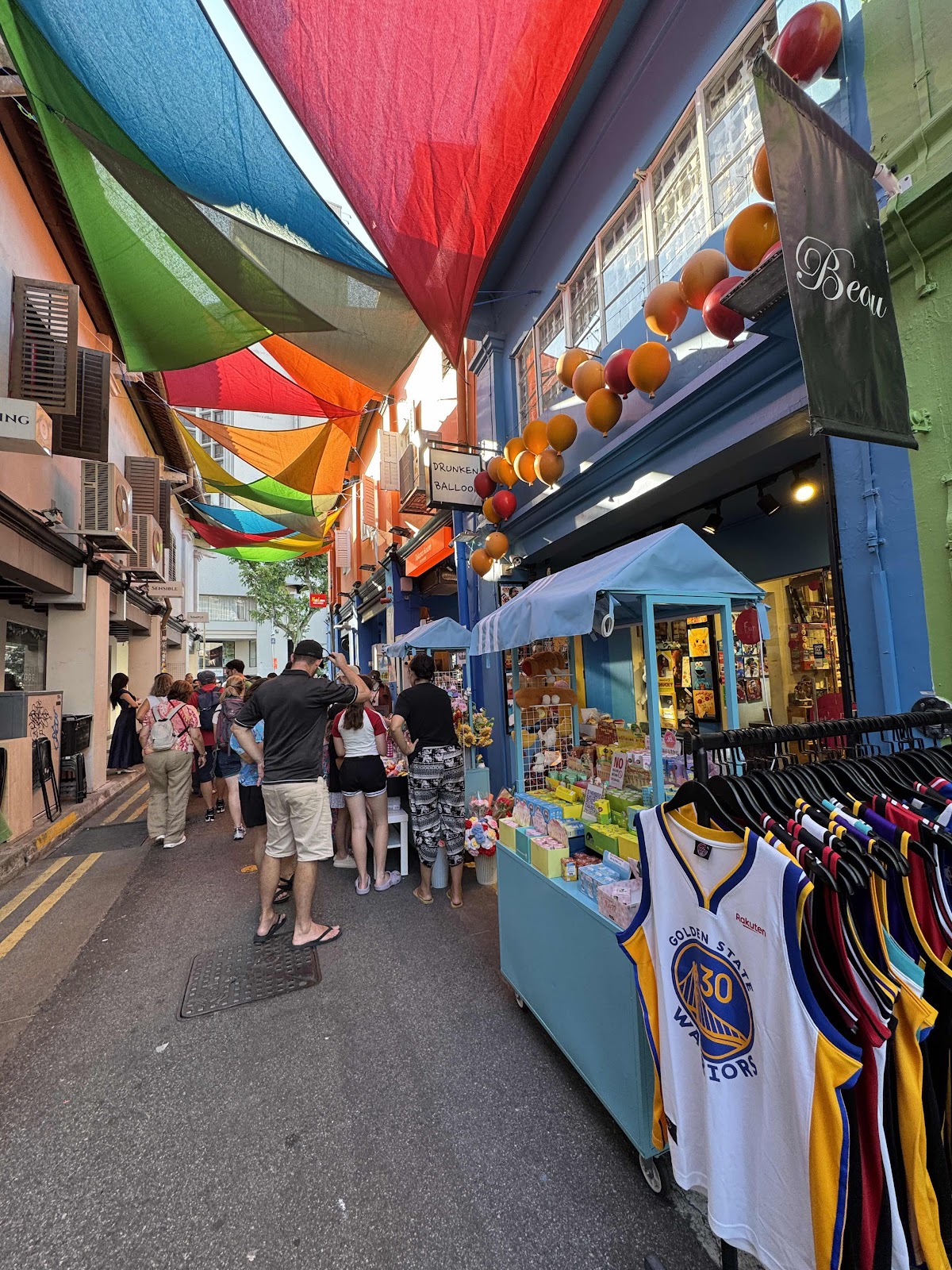Hier gab es viel zu sehen und durch viele Gassen und kleine Straßen war es auch immer wieder sehr abwechslungsreich. Es war kein „typisches“ Chinatown, eher ein Bezirk, der sehr gut in Singapur integriert ist. Ein Besuch in einem Tempel blieb nicht aus und es gab auch frisch zubereitete Smothies zur Abkühlung. Danach ging es weiter in die Arab Street. Bevor es weitergehen sollte, haben wir uns noch einen kleinen Snack in der Pita Backery gegönnt. Während wir auf das Essen gewartet haben, wurde die Location für den Sonnenuntergang festgelegt - Mr. Stork, eine Rooftop Bar.