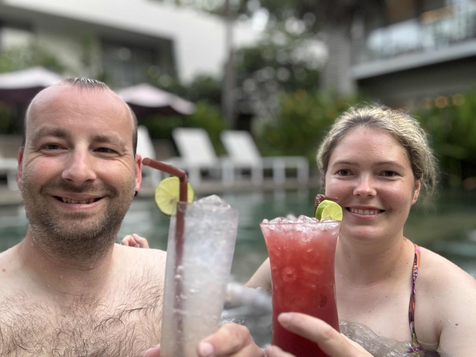 Daraufhin war Pooltime! Ab ins Wasser - ein bisschen was war los aber nicht zu viel. Wir haben ein bisschen geplanscht und nach 45 Minuten ging unsere Happy Hour los immer von 6-7pm. Pro Person 2 Cocktails for free an der Pool Bar. So lässt sichs aushalten.