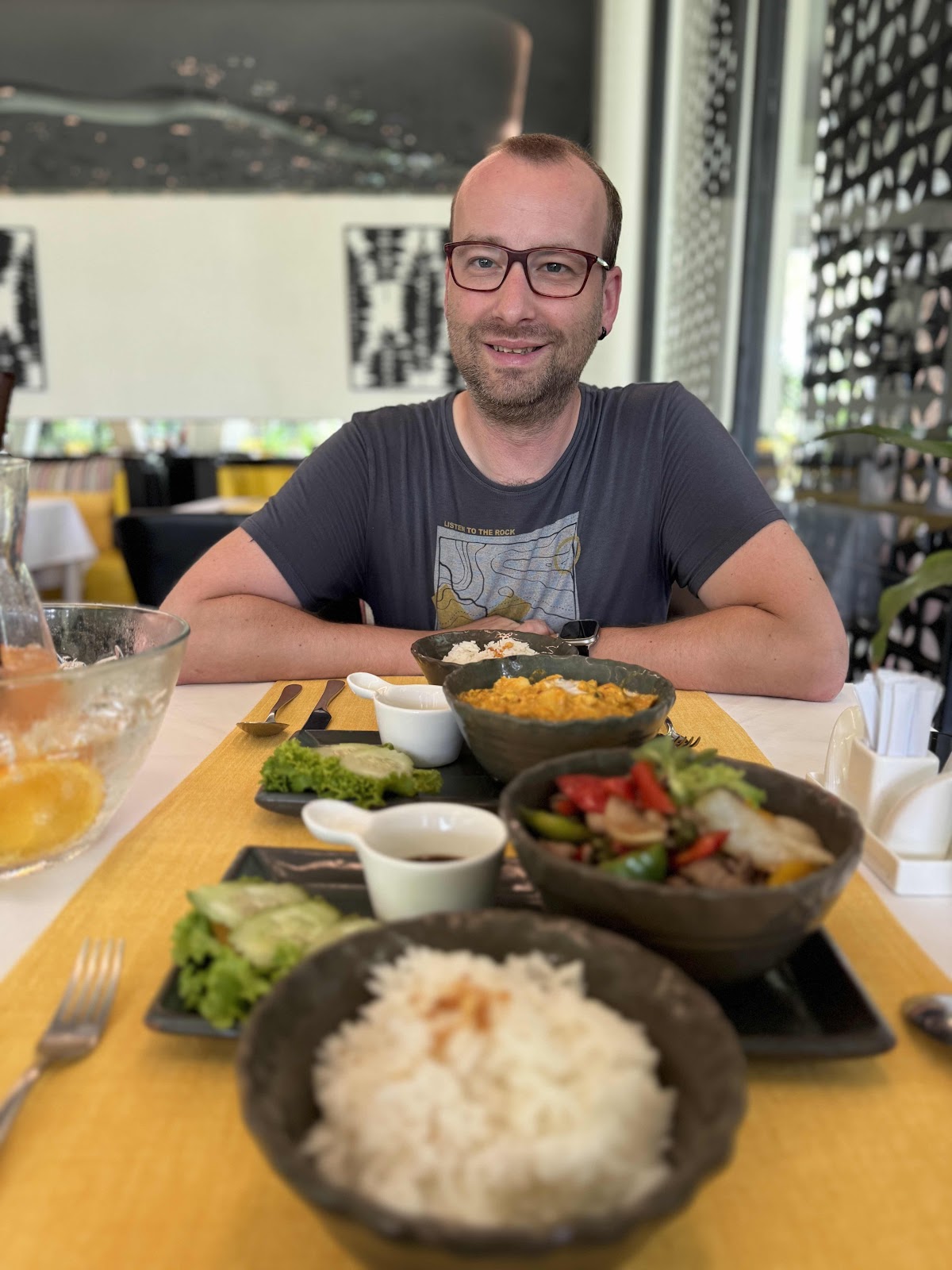 Ein Film und schon waren wir wieder im Landeanflug. Zwischendurch gab es Frühstück. Von der Einreise kann man nur begeistert sein. Aus dem Flieger raus, zur Immigration, dort über 3 Stationen das „Visa on arrival“ abgeholt (Pass abgeben, zahlen, Pass mit Visum abholen) und noch fix zur Passkontrolle. der Stempel wurde durch einen Aufkleber mit QR Code ersetzt wurde. Kaum waren wir durch, kamen unser Koffer auf dem Band an und wir konnten aus dem Flughafen raus. Direkt neben der Tür war ein ATM, an dem Christian Geld abgehoben hatte. Währenddessen wurde Moni für einen Transport zum Hotel angesprochen. Der Preis war fair und sogar günstiger als Grab. Also ab dafür. Die Fahrt war eine knappe Stunde und schon waren wir am Hotel.