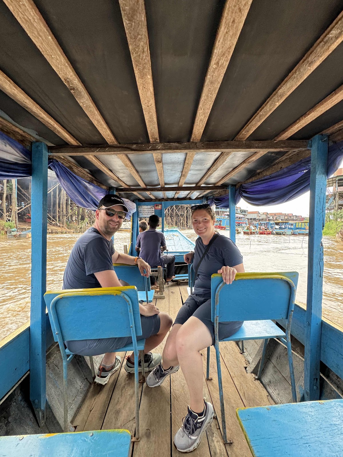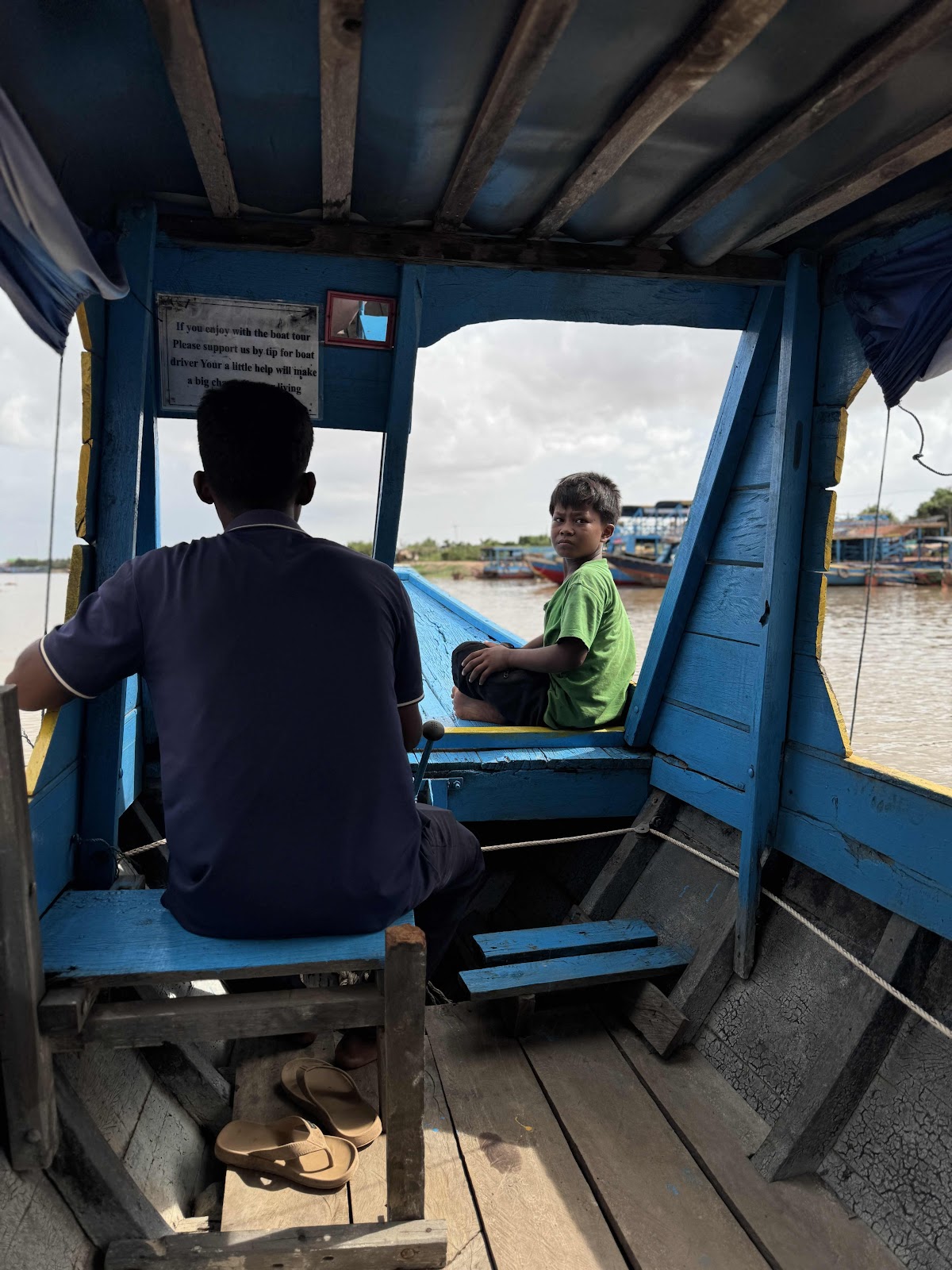 Mit komplett matschigen, aber nach außen wasserfesten Schuhe sind wir dann am Auto angekommen. Weiter ging’s von dort auf eine längere Fahrt zur Bootsfahrt auf dem Tongle Sap See. Dort angekommen lagen sehr, sehr sehr viele Schiffe herum und wir konnten uns Turis an zwei Händen abzählen. Wir bekamen ein kleines, ca 8 Sitzer Boot für uns und unseren Guide alleine. Gefahren vom Bootsführer und einem kleinen Kind, das beim Ein- und ausparken half.