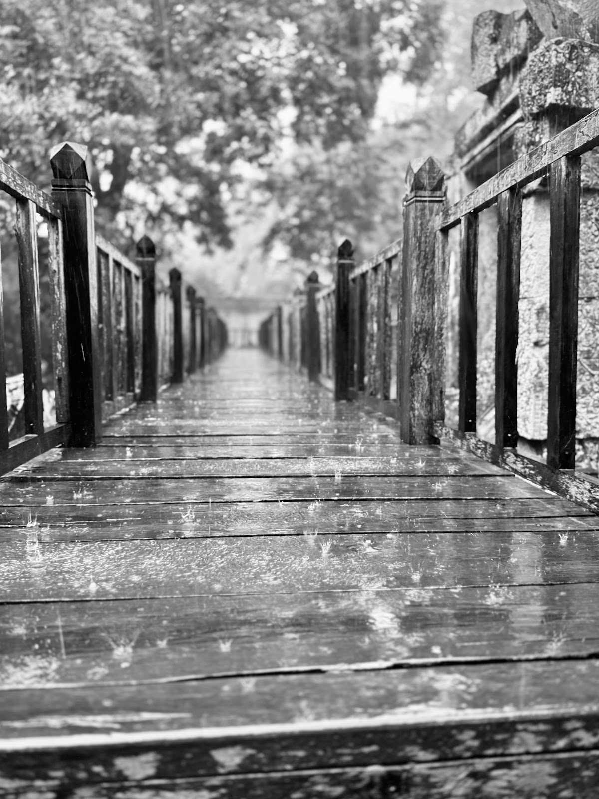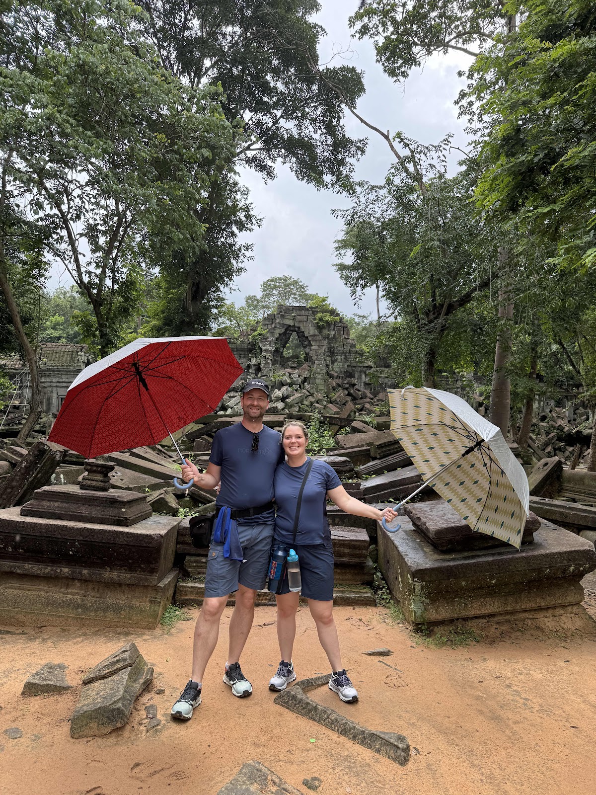 Weiter ging es nun zu einem Tempel - hatten wir die letzten Tage ja eher wenige gesehen. Dieser Tempel wurde nicht wieder aufgebaut, ist so alt wie Angkor Wat und erst seit ca. 2003 wieder zugänglich nachdem er von 438 Landmienen in Zusammenarbeit mit Deutschland befreit wurde. Natürlich fing es nun aber so richtig an zu regnen - wir mit Regenschirmen ausgestattet aber los. Der lehmige Weg wurde bald sehr matschig, auf den Stufen und den Holzlatten entstanden tiefe Pfützen. Ansonsten haben wir ein paar Fotos gemacht und wurden trotz Schirm immer nasser.