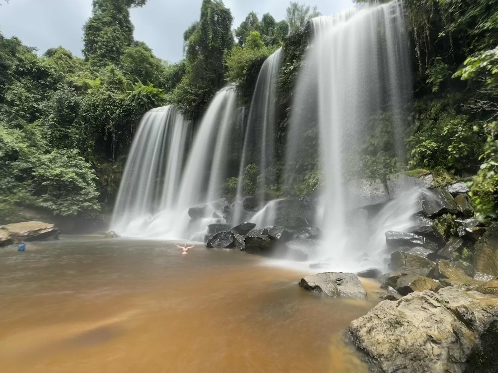 Danach ging es weiter zur Buddha Statue wo wir dreimal läuten sollten um den Wunsch zu bekräftigen. Dort oben noch kurz die Aussicht genossen und dann zurück. Schuhe an und durch das kleine Dorf in Richtung Wasserfall. Es war eine lehmige Straße mit Steinen und viel Müll. Erst war es ein kleiner Wasserfall nur 5m hoch, dann ein paar Stufen weiter unten der 30m hohe Wasserfall. Hier konnten wir „duschen“ gehen, im heiligen Wasser das durch die Linga weiter oben im Flussbett heilig wurde. 4000 Riad beisammen konnten wir uns die Umkleidekabine leisten (=1$) und ab ins Wasser. Für die Kiste zum Aufbewahren der Klamotten hätten wir noch einen Dollar benötigt, hatten wir aber nicht dabei. Also Klamotten zurück zu unserem Guide gebracht. Am Anfang war das Wasser recht kalt, aber einmal drinnen dann angenehm. Christian ging gleich richtig unter den Wasserfall, Moni nicht, die Haare sollten nicht so nass werden.