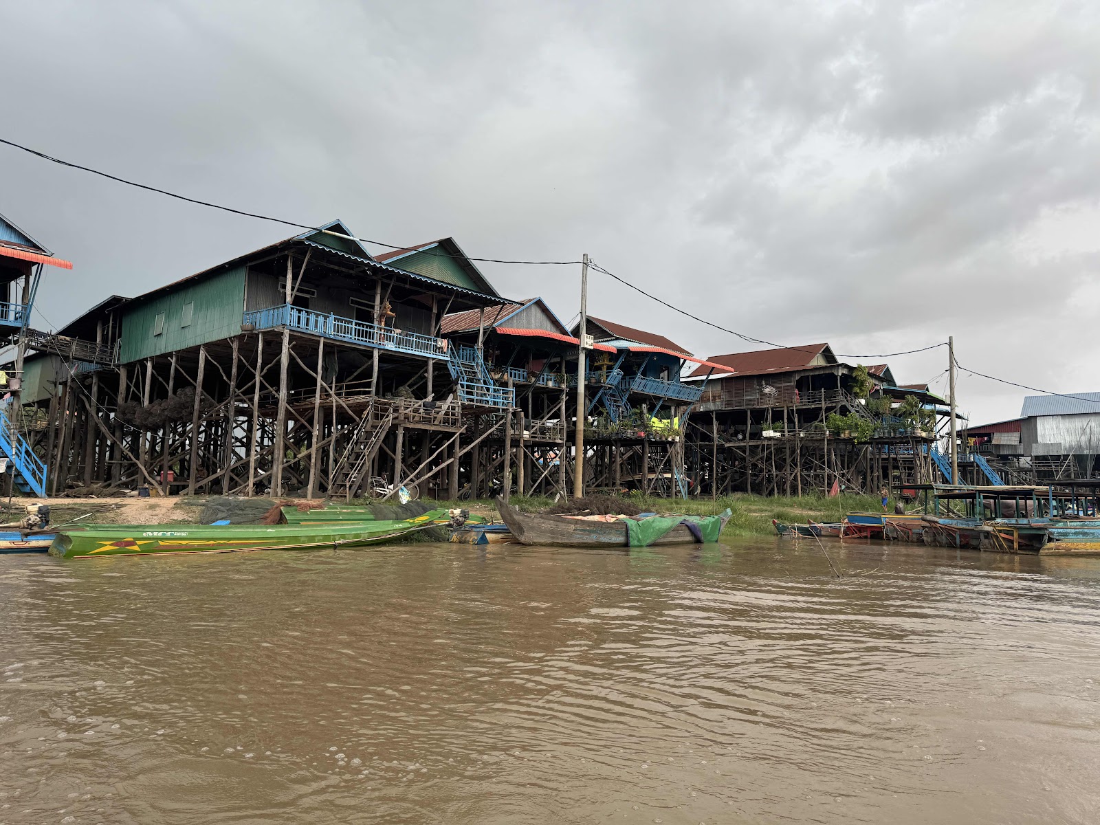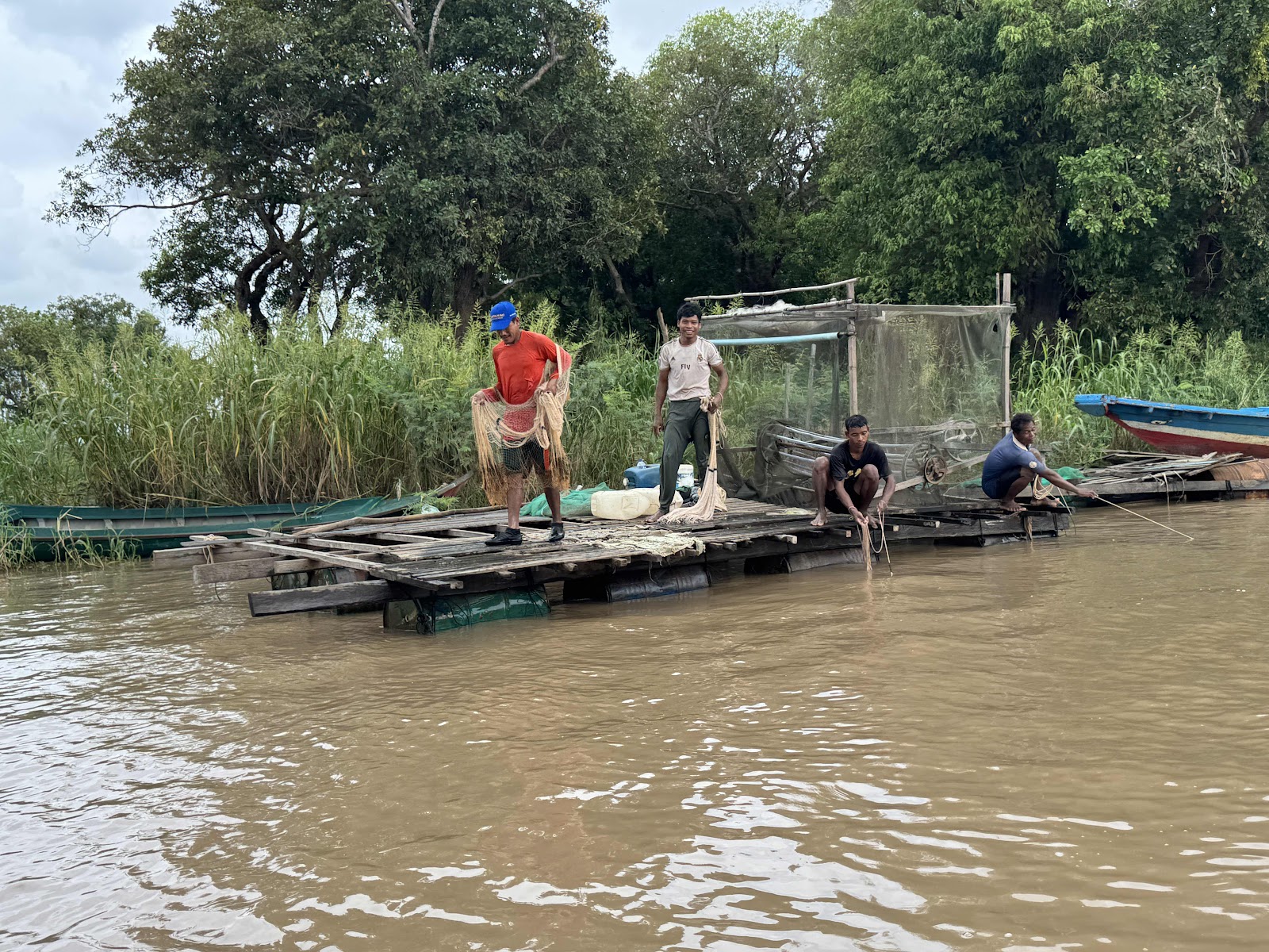 Solange das Wasser noch nicht da ist, wurde der Boden der Häuser für Feuer, Müll und Sonstiges verwendet. Schon sehr dreckig und vielleicht ein hartes Wort, aber elendig. Ein paar Fischer stehen auf schwimmendem Holz im Fluss und werfen Netze auf, um Fische zu fangen.
