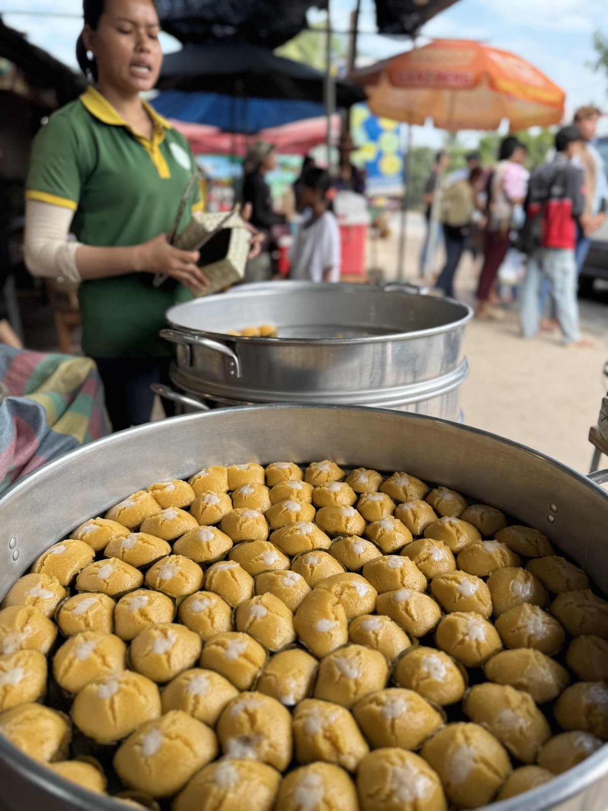 Nach eigener Aussage mag er es viel zu reden. Die knappe 1,5h Fahrt redete er auch viel und gab uns viele Informationen zur Umgebung und dem Land. Der erste Stopp war ein kurzer Besuch auf einem Markt in der Umgebung von Siem Reap. Dort hat er uns gezeigt wie so eine Art Muffins hergestellt werden aus der Frucht der weiblichen der Palme.