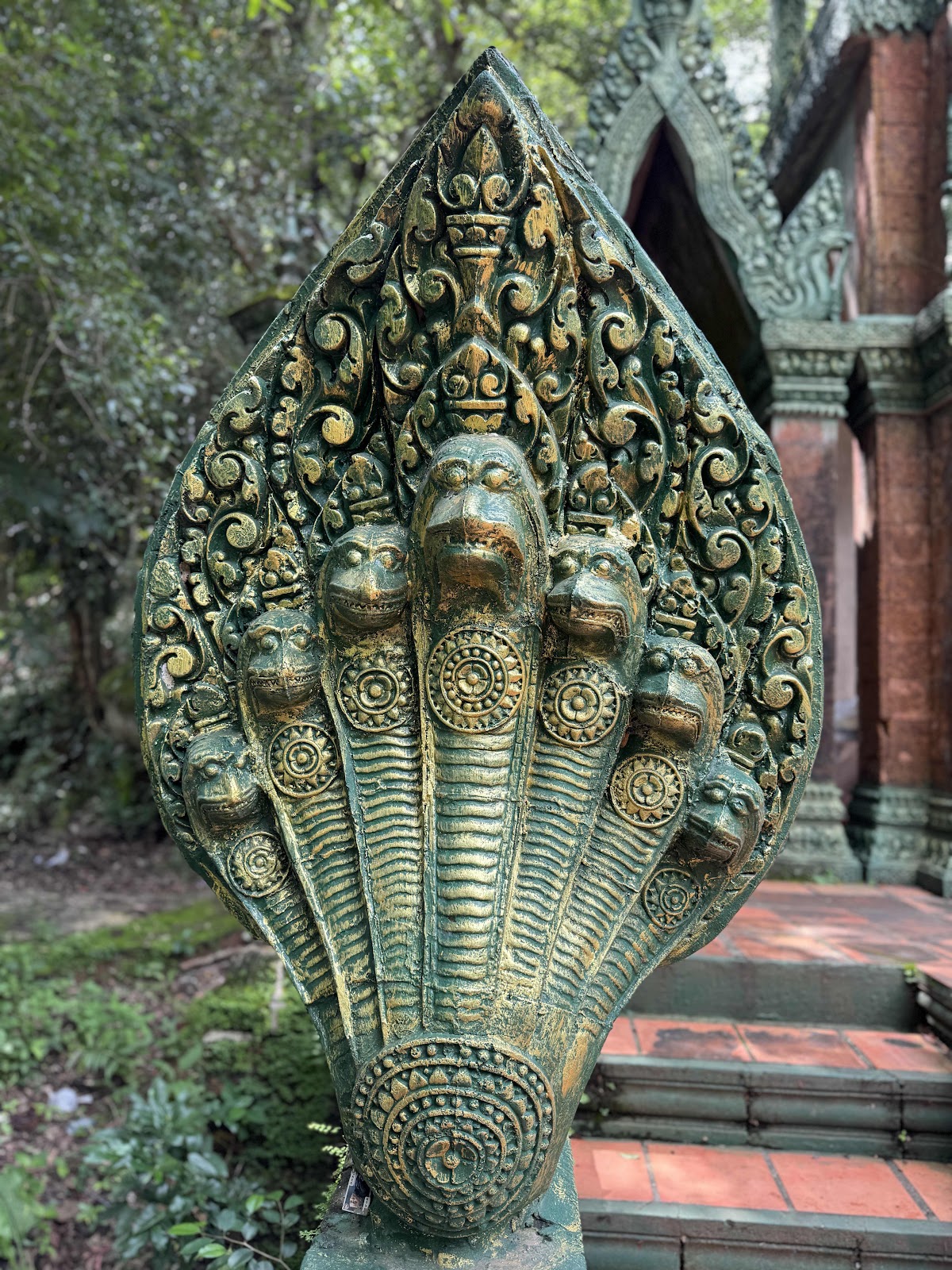 Nächster Spot war der große Buddha am höchsten Teil des Berges. Er ist dort aus dem Felsen heraus geschlagen und 3 Meter hoch. Doch bevor wir die > 200 (flachen) Stufen hinauf sind, haben wir Lotus Blumen, als Gabe zu unserem Gebet gekauft. Erst mussten wir dann vor dem Altar die Schuhe ausziehen und dann konnten wir beten, also einen Wunsch äußern, und die Blume als Dank hinlegen.