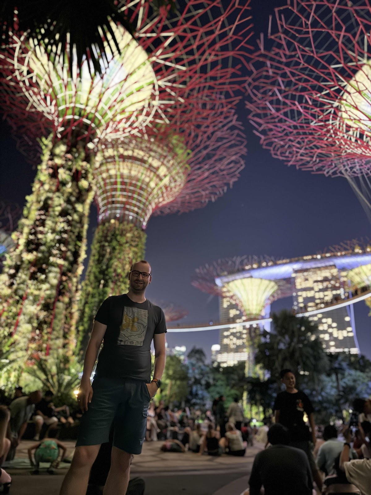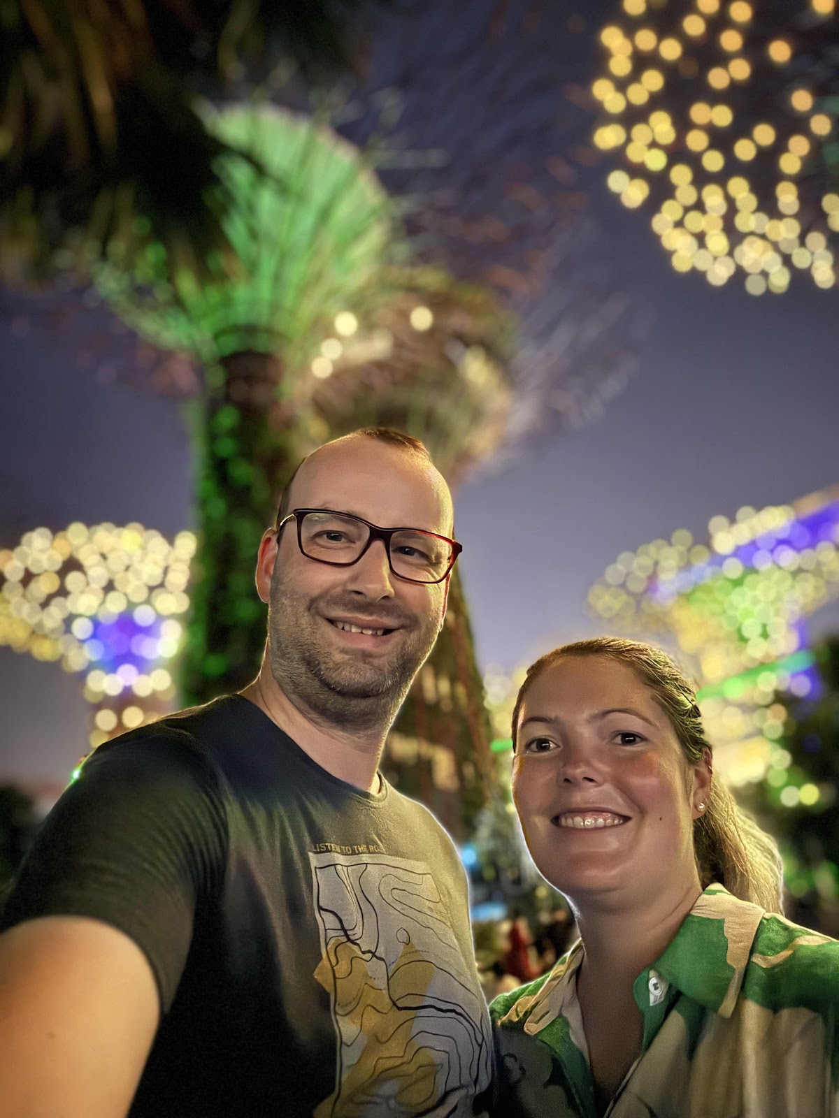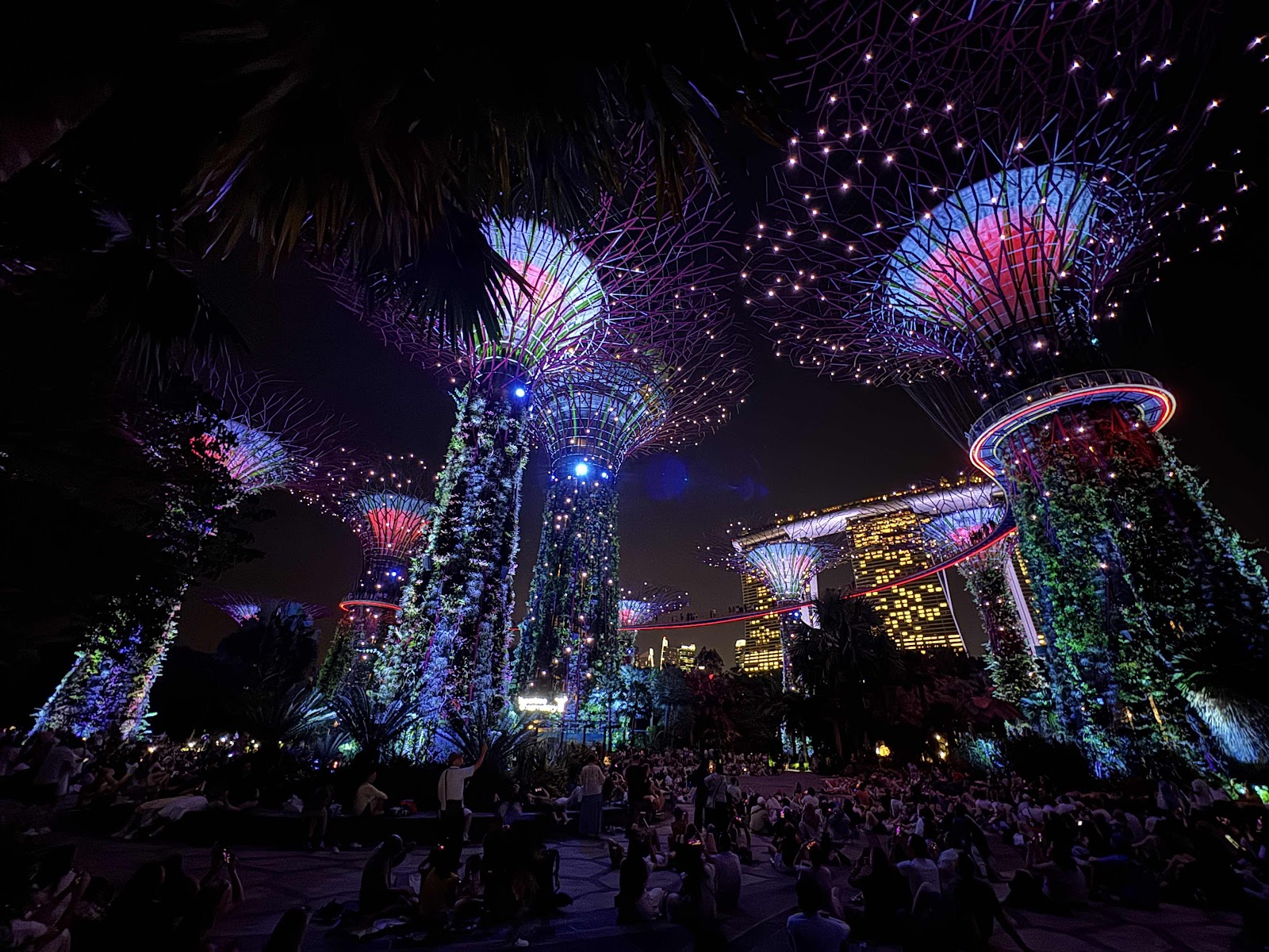 Ein bisschen packen und dann wieder los zum Abendessens Treffpunkt, zum Thai Curry, dieses Mal auch mit Berni, der bis 18:00 Feierabend machen sollte. Mit dem Bus eine Stunde unterwegs, dann angekommen. Der Treffpunkt war ein kleiner lokaler Hawker, und wir haben bei Chiang Mai Thai thailändisch bestellt. Sehr lecker. So saßen wir gemütlich bis gegen 20 Uhr, dann musste Berni erneut Richtung Meeting und wir Richtung Lichter- und Musikshow im Super Tree Groves. Mit dem Grab ging es gut hin, die letzten Meter gelaufen weil Stau war und vor Ort einen Platz gesucht und Stativ aufgebaut. Schon ging es los, Motto: alte Song-Klassiker. So tanzten dann die LEDs der Bäume zu z.B. Grease „the one that I want“.