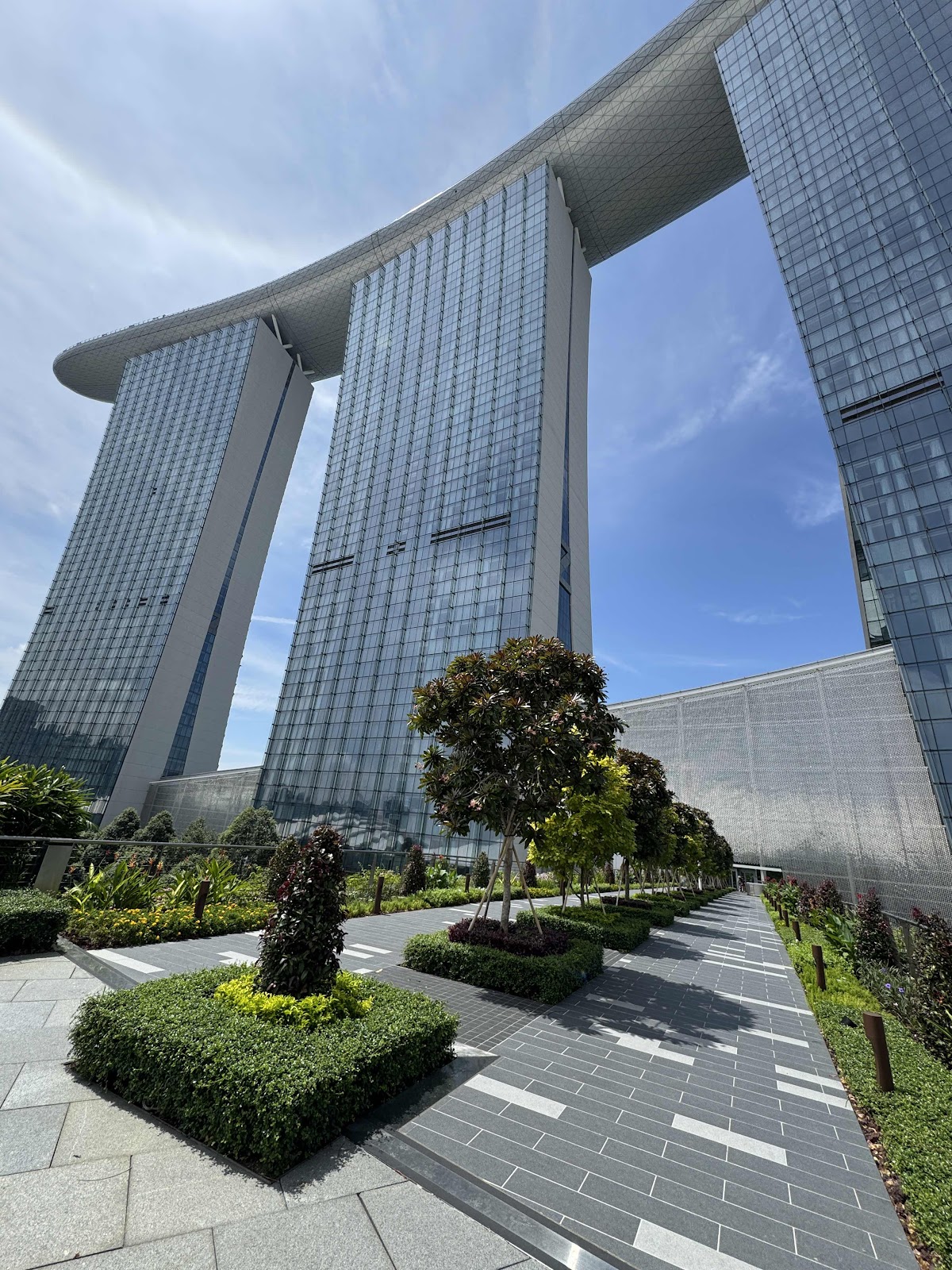 Der Skywalk oder Rooftop hatte uns von der Aussicht auch nicht überzeugt, so sind wir direkt weiter. Es ging zum Marina Bay Sands Komplex durch den wir mussten, um auf die andere Seite zu gelangen. Kurz vor dem Eingang hatten wir noch mal eine gute Aussicht auf das Riesenrad, die Trees und der Natur drum herum und Marina Bay Sands.