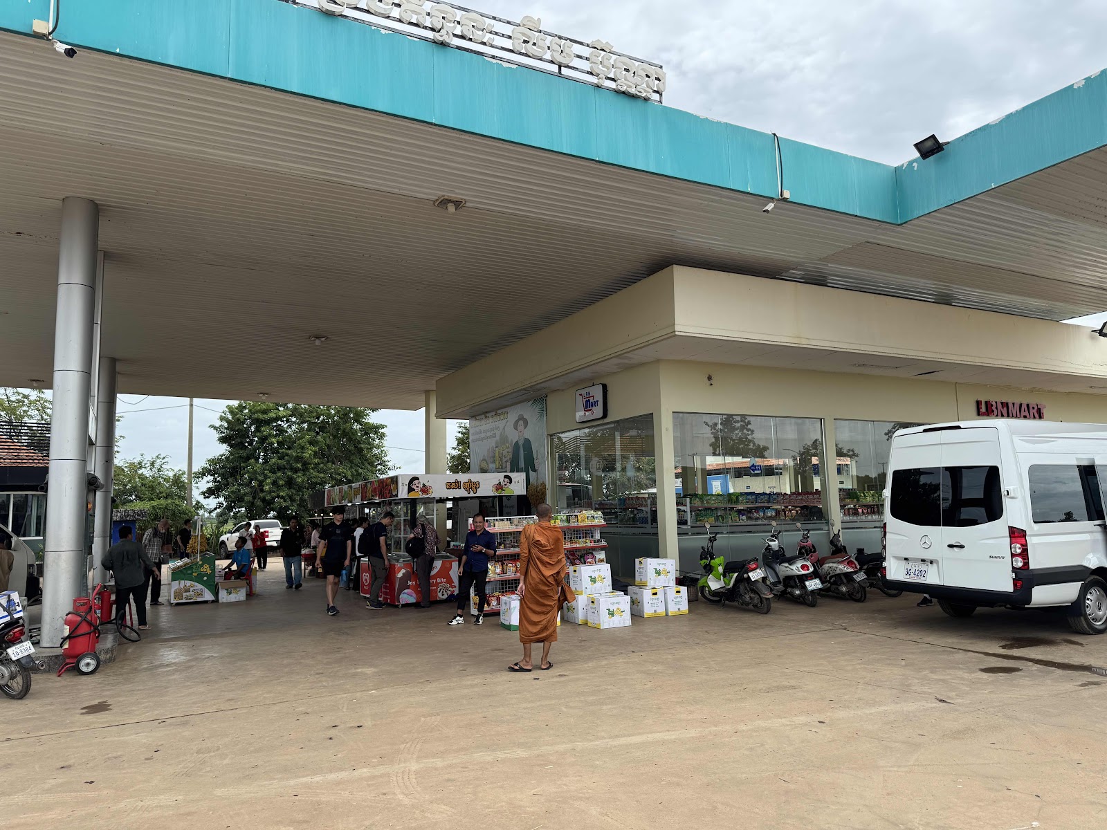 Wenig später waren wir am „Busbahnhof“. Also eher an der Straße mit einem Büro. Wir konnten „einchecken“ für unsere Sitze und dann warten, bis der Bus vorgefahren war. Dann noch unser Gepäck verstaut und auf die Sitze. Pünktlich 8:30 Uhr sind wir abgefahren. Durch Siem Reap hat es sich etwas gezogen wegen Verkehr und vor allem den vielen Tuktuks.
