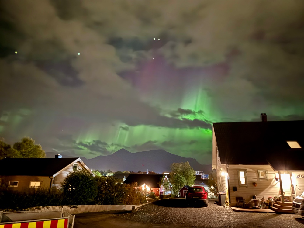 Pünktlich ging es los auf die guten 3 Stunden Fahrt. Während Christian sich ein wenig gequält hat sein Buch fertig zu lesen, hat sich Moni mit Schulung und Film die Zeit vertrieben. Gegen 20 Uhr waren wir in Moskenes - auf den Lofoten. Schon auf der Fähre gab es einen „Aurora Alarm“. Leider waren aber viele Wolken am Himmel. Je näher wir unserem Zwischenziel gekommen sind, desto geringer war die Wahrscheinlichkeit heute Nordlichter zu sehen, denn es fing an zu Regnen. Also dann doch direkt zur Wohnung. Auf dem Weg hat es noch mehr geregnet, allerdings aufgehört, als wir da waren. So konnten wir im Trockenen auspacken. Vom Parkplatz aus vor der Wohnung konnten wir leicht die ersten Lichter sehen. Bei der Wolkenlage lohnt es sich aber nicht aufzubrechen.