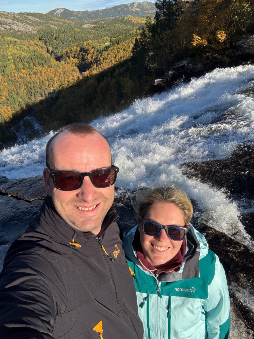 Gefunden haben wir in der Nähe den Wasserfall Valnesfossen. Eine Viertelstunde später waren wir am Parkplatz. Doch die Wanderung (am Schild mit 3,2km beschrieben) fanden wir nicht. Man kommt von Parkplatz auch an den Kopf des Wasserfalls. Ein kleiner Trampelpfad führte dann etwas seitlich und so konnten wir nach unten zum Flussbett schauen und leicht schräg auf den Wasserfall. Schön! Hat sich gelohnt, auch bei dem schönen Wetter.