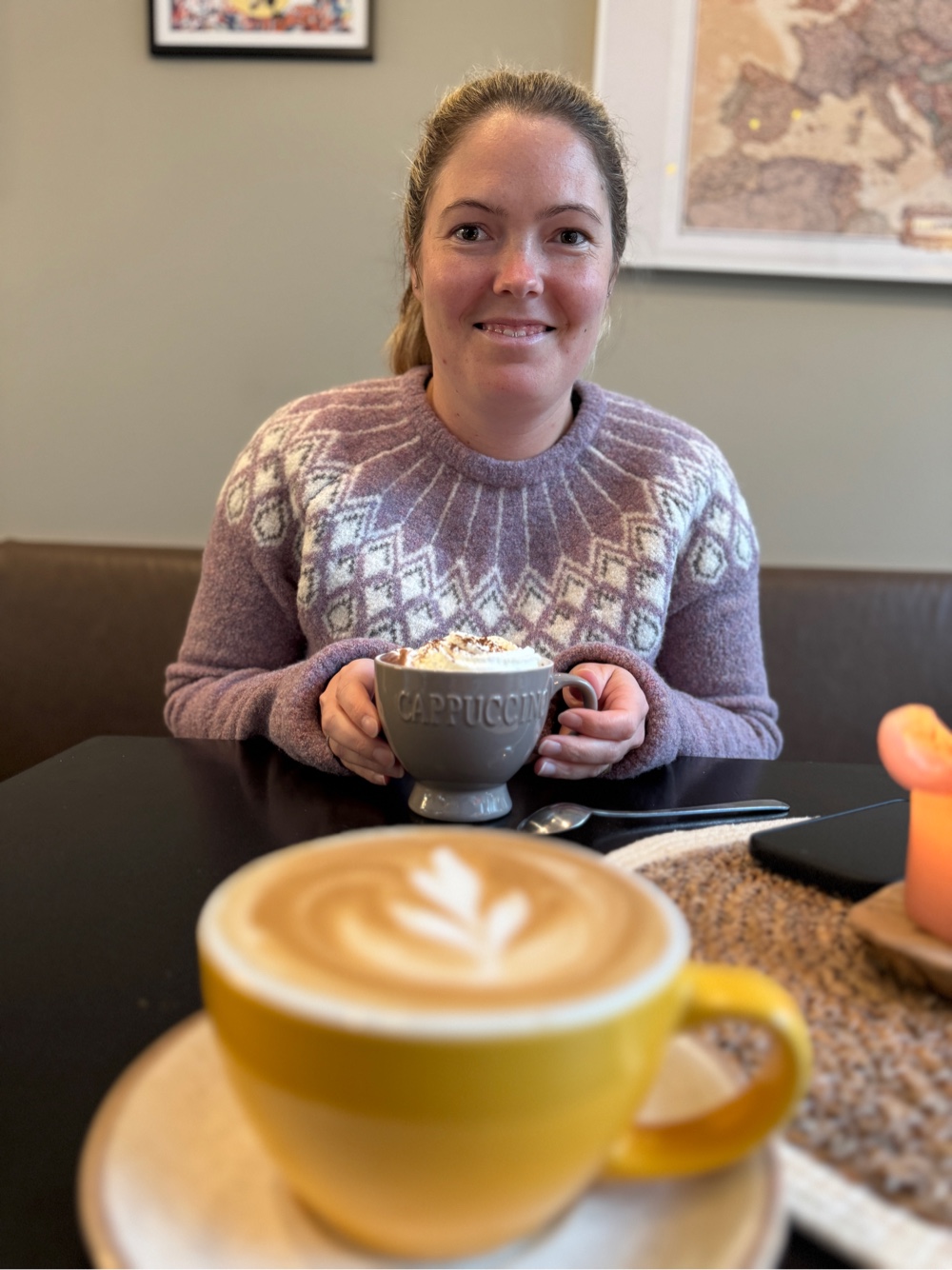 Da wir heute nach dem Mittagessen noch in ein Kaffee wollten, mussten wir heute früher zum Mittag los. Es ging in ein Restaurant „Nordis“. Hier gab’s geteilte Fischsuppe als Vorspeise und danach einen Burger und Fish&Chips. In einer der seltenen Regenpausen sind wir dann ins Café Laura umgezogen wo es Latte und Kakao gab.
