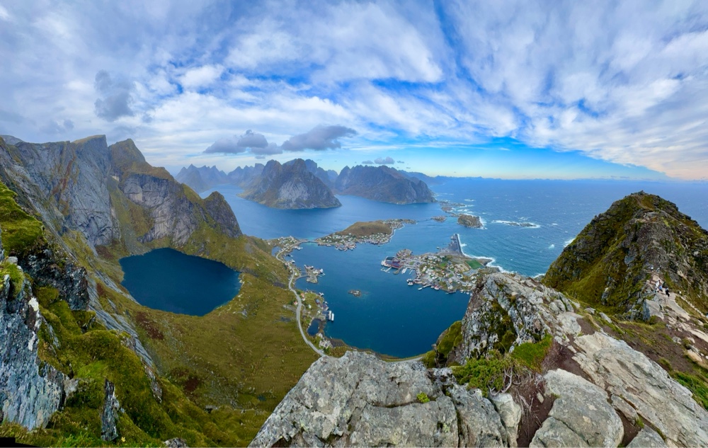 Am Reinebringen angekommen, hatten wir auf einem der sehr überfüllten Parkplätze Glück, dass wir uns noch drauf quetschen konnten. Der angekündigte Wind war auch schon hier enorm. Im Vorbeifahren an Reine hatten wir auch schon die hohen Wellen und Brandung gesehen. Also Rucksäcke fertig und los. Es waren vom Parkplatz 1,3 km bis zum Trailhead. Ab da begann der Aufstieg wie bekannt über Stufen. Schritt für Schritt ging es hoch und schon nach 300 Stufen hatten wir gut zu schnaufen und brauchten immer wieder kurze Pausen. Nach knapp 1000 Stufen bleiben wir auf einer der vielen Sitzmöglichkeiten etwas länger sitzen und haben 2 junge Deutsche aus Stuttgart kennengelernt. Hier haben wir uns ne Weile unterhalten und für später verabredet. Dann sind wir weiter und waren gewarnt dass es am Aussichtspunkt noch mal viel windiger sein wird. Einige krabbeln da oben wohl zum Teil auf allen vieren.