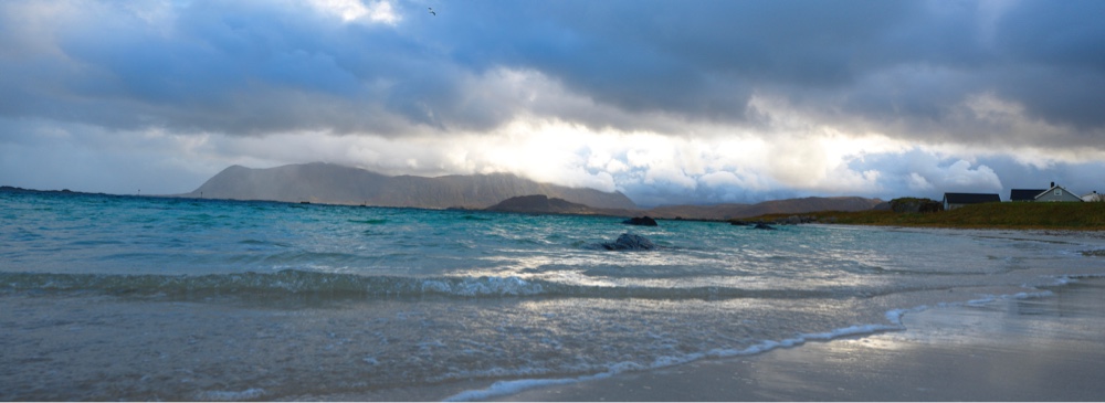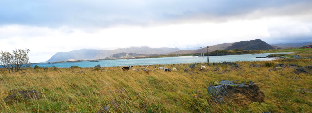 Heute wollten wir auf dem Weg nach Svolvær entweder den Blåtinden hochlaufen oder auf den Finnkjerka. Doch am Parkplatz des Finnkjerka angekommen hingen die Wolken tief und es ging leicht an zu nieseln. Da der Blåtinden nicht weit weg ist, sahen wir hier das gleiche Wetter. So haben wir hin und her überlegt ob wir dennoch los laufen - mehr des Laufens Willen als der Aussicht wegen. Wir entschieden uns gegen das Wandern. Stattdessen sind wir noch mal nach Eggund abgebogen. Doch dort sollten wir wieder fürs parken zahlen also sind wir wieder umgekehrt. Auf dem Rückweg noch ein bisschen das türkise Wasser und ein paar Schafe fotografiert und nun konnten wir sehen, dass die richtige Regenwolke nun über unserer Wanderung hing. Also alles richtig gemacht.